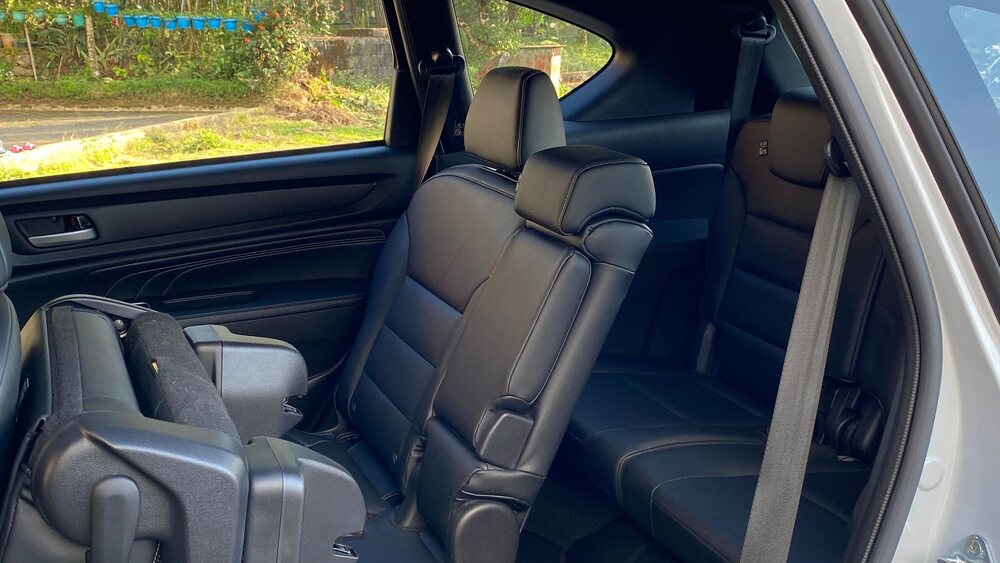 ACCESS TO THE THIRD ROW. That left second row seat when folded also provides a great platform for securing a cage. It is best to travel with another human. And no pets on the front seat. (Photo by Mika Fernandez-David of ignition.ph)
