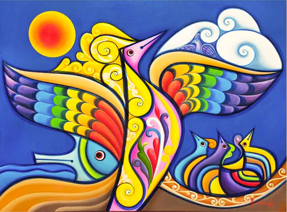 Abdul Mari Asia Imao, the son of Tausí¼g stone crushers, is the Philippines’ first Moro National Artist. Receiving art scholarships from the University of the Philippines and distinguished fine art universities overseas, this master artist held on deeply to his roots and came back home to promote the art and culture of Mindanao. He is known for painting and sculpting sari-fish, sari-ukkir, and sari-mosques as well as sarimanoks. “Sarimanok Series 2014” is a vibrant piece of art that represents the history and artistry of Abdulmari Asia Imao.