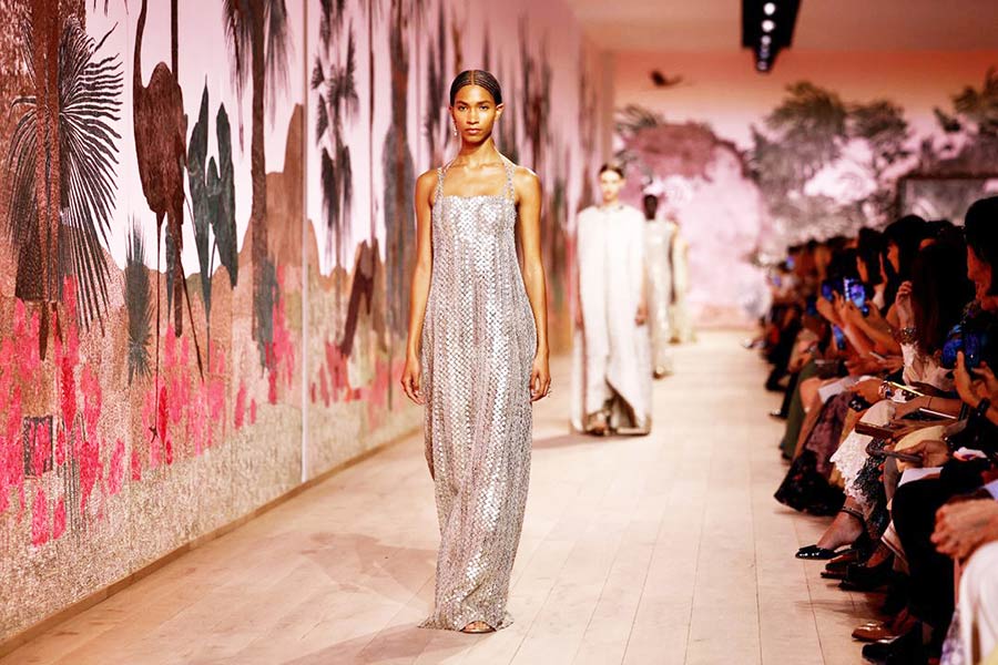 PARIS. – For her fall show, Dior designer Maria Grazia Chiuri reined in the volumes often associated with haute couture fashion and sent out a line-up of slender dresses and capes in neutral tones and touches of gold and silver.