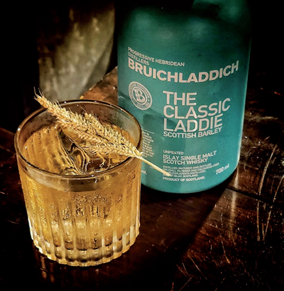 The Paddy Field for those with a sweet tooth. Mix together 45ml of Bruichladdie, 15ml of Amontillado Sherry, 5ml of rice syrup, and 2 dashes of chocolate bitters. This is then garnished with wheat trigo and served in a rocks glass.