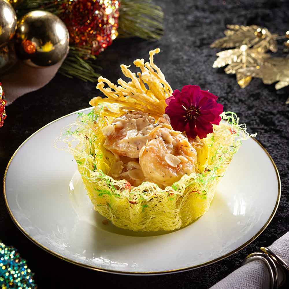 Crystal Dragon’s Wok-fried Prawns in homemade cheese sauce with crispy enoki mushrooms