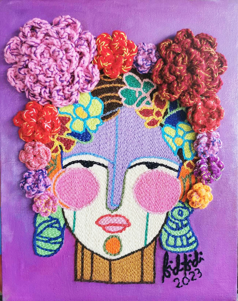 Bidibidi, on the other hand, prefers to paint colorful flowers, but has also what she calls an “artivist” practice of including underemployed farmers wives into her social enterprise by providing original embroidery patterns which they then interpret, simultaneously providing much needed livelihood to them, and preserving the tradition which her community in Ba’ao, Camarines Sur, was once famous for, and through her intervention, again.