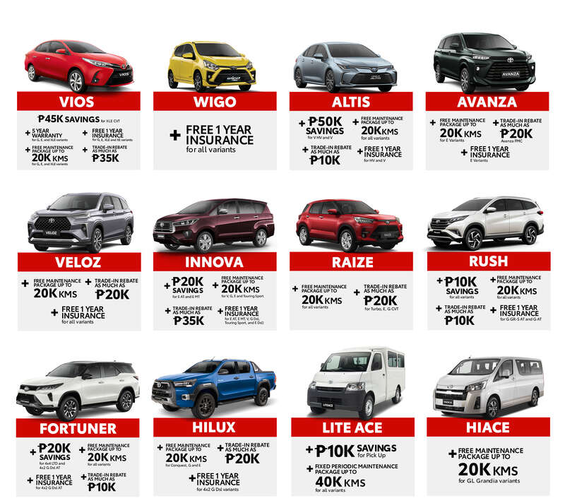 Lastly, under the Cash Savings option, customers who choose to pay in cash can get big savings for the following vehicles: save PHP50,000 when you purchase the Corolla Altis V HV and V, P45,000 and P8,500 on the Vios XLE CVT and XE CVT, respectively, P10,000 on all Rush variants, P10,000 on the Lite Ace pickup, and more!