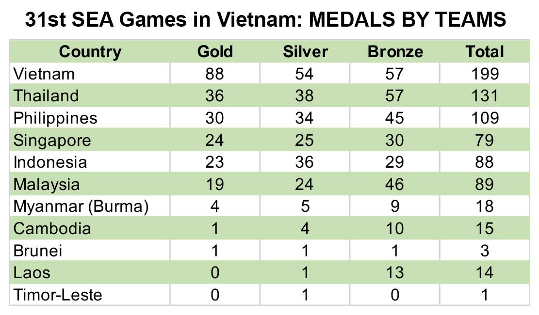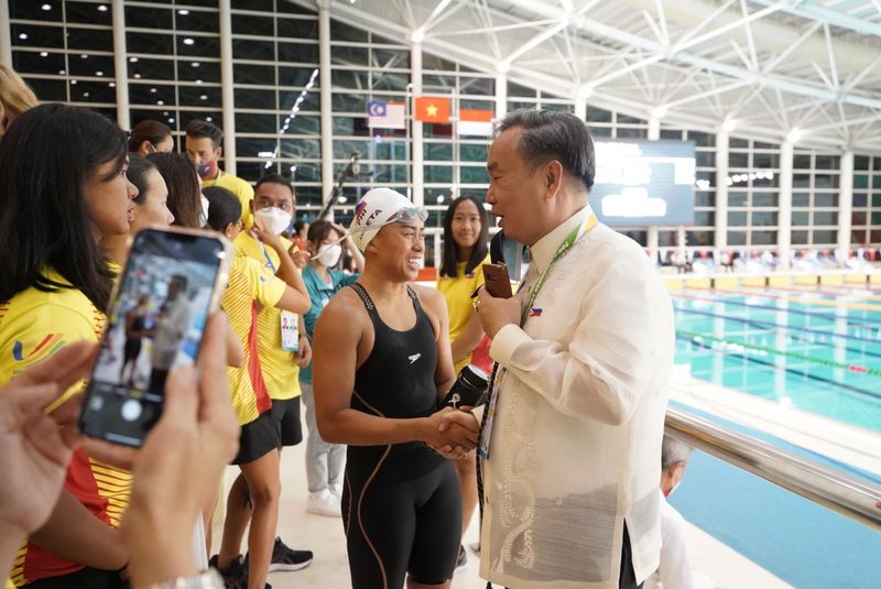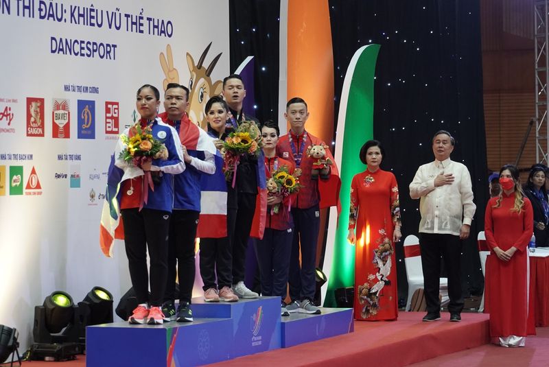 DANCESPORT GOLD: Philippine Olympic Committee President and Rep. Abraham “Bambol” Tolentino awards one of the four gold medals won by Pinoy entries in dancesport on Monday.SWIMMING GOLD: Philippine Olympic Committee President Rep. Abraham “Bambol” Tolentino congratulates swimmer Chloe Isleta for winning the women’s 200 meters backstroke on Monday night at the National Sports Complex’s Aquatics Sports Palace in Hanoi.