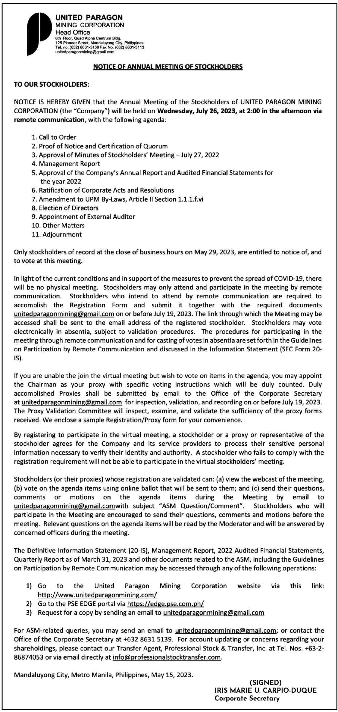 NOTICE OF ANNUAL MEETING OF STOCKHOLDERS: United Paragon Mining Corp. ___ July 4, 2023 Share FacebookTwitterPinterestWhatsApp Previous articleTraveling exhibit showcases renaissance masterpieceNext article ___ Share post: FacebookTwitterPinterestWhatsApp