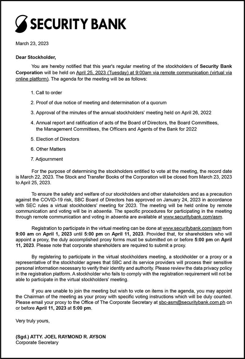 NOTICE OF REGULAR MEETING OF STOCKHOLDERS: Security Bank ___ March 31, 2023 Share FacebookTwitterPinterestWhatsApp Previous articleJeremy Renner says he broke over 30 bones in snowplow accidentNext article ___ Share post: FacebookTwitterPinterestWhatsApp