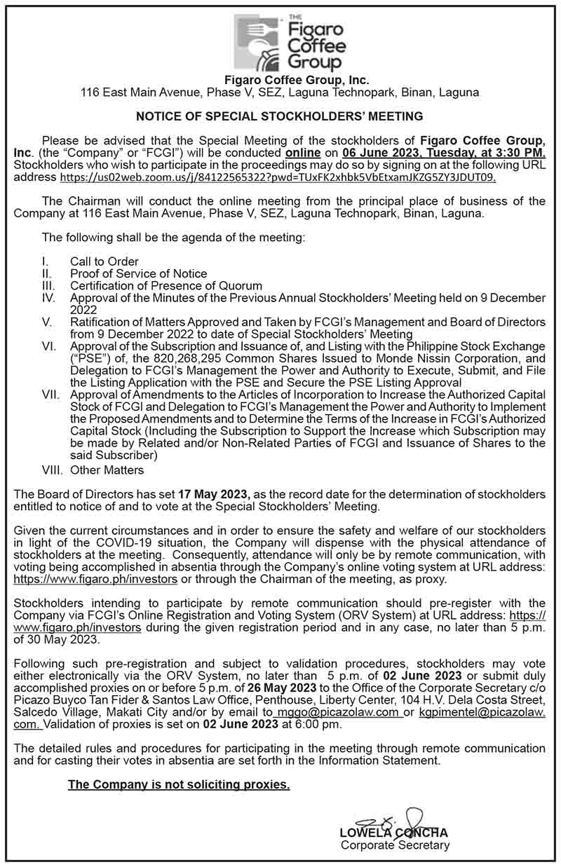 NOTICE OF SPECIAL STOCKHOLDERS’ MEETING: Figaro Coffee Group, Inc. ___ May 16, 2023 Share FacebookTwitterPinterestWhatsApp Previous articleMarketing and snacking made rightNext article ___ Share post: FacebookTwitterPinterestWhatsApp