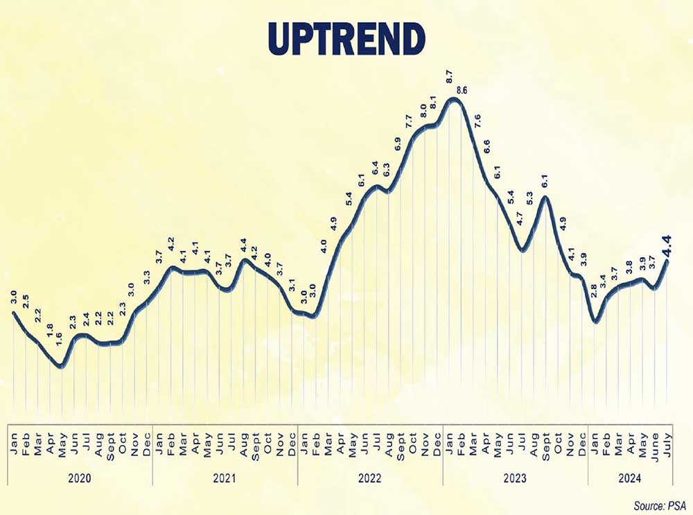Higher prices of food, transport and utilities pushed inflation higher to 4.4 percent in July from the previous month’s 3.7 percent, the Philippine Statistics Authority yesterday said.