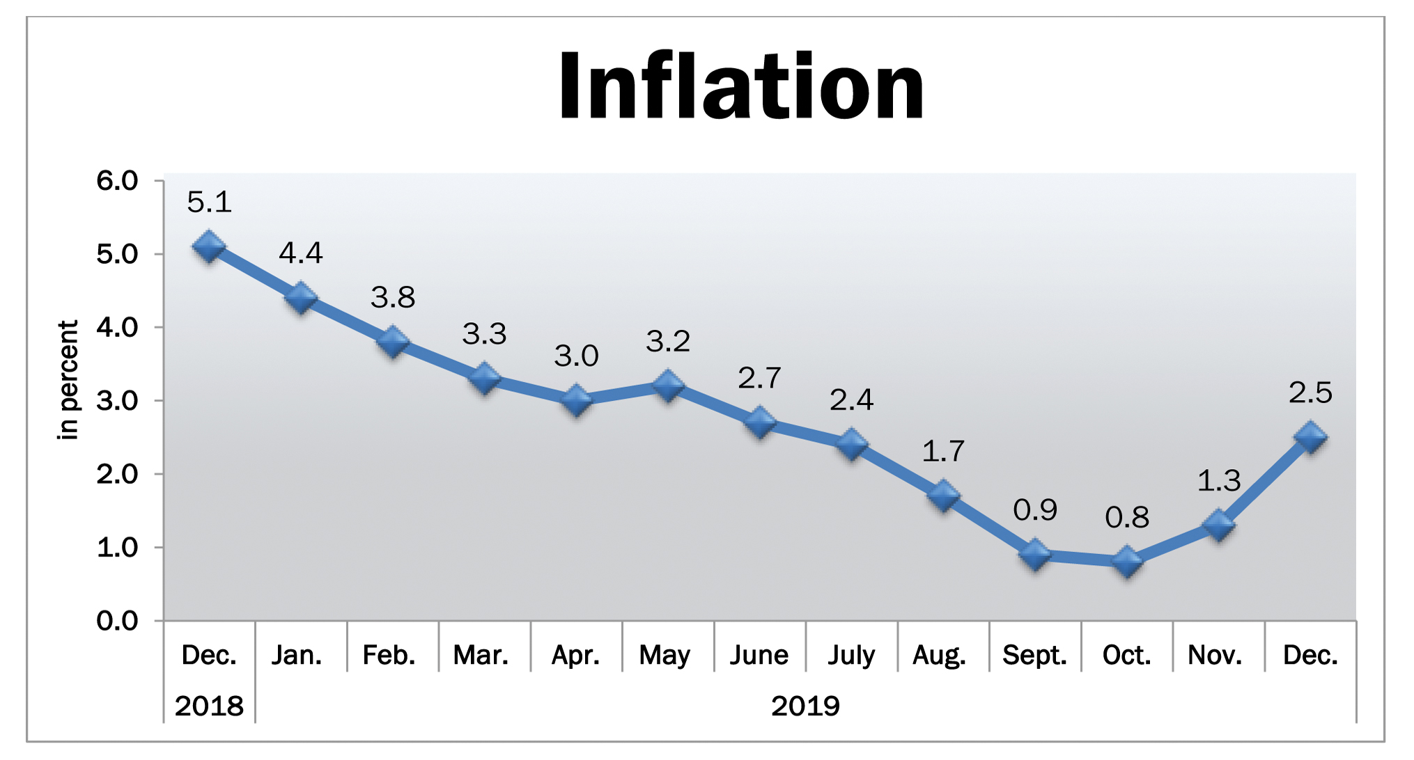 Prices of consumer items in areas outside NCR, likewise, accelerated further by 2.4 percent in December 2019. In the previous month, inflation in AONCR was registered at 1.2 percent and in December 2018, 5.3 percent.
