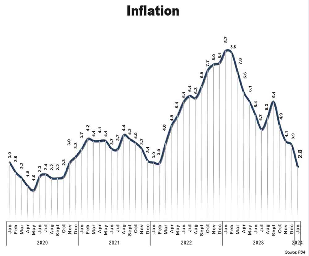 Following the trend at the national level, the Philippine Statistics Authority said inflation rate in the National Capital Region (NCR) also decelerated to 2.8 percent in January 2024 from 3.5 percent in December 2023, mainly influenced by the slower annual increase in the housing, water, electricity, gas and other fuels index.