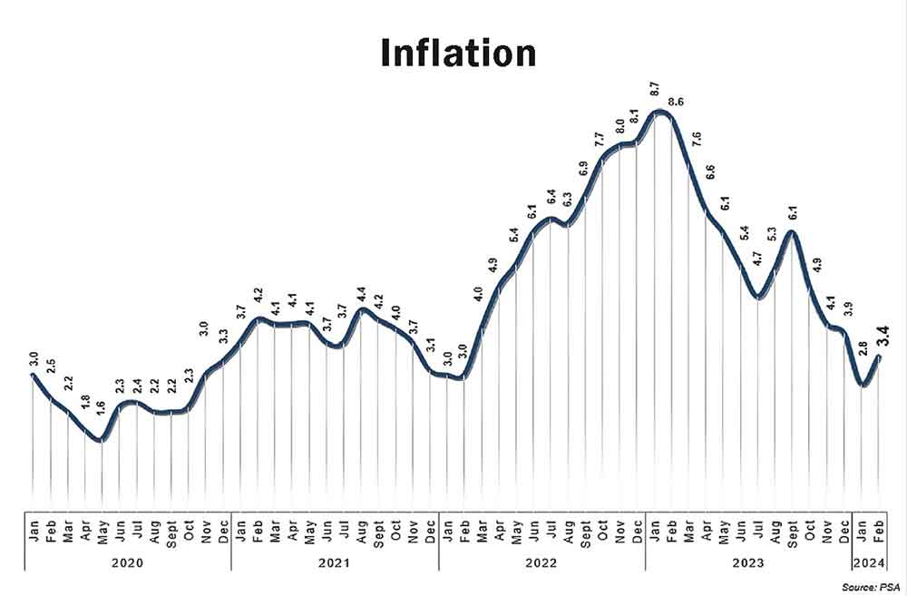 “The top three commodity groups contributing to the February 2024 overall inflation were food and non-alcoholic beverages with 52.1 percent share, restaurants and accommodation services with 15.3 percent share and housing, water, electricity, gas and other fuels with 5.8 percent share,” Mapa said.
