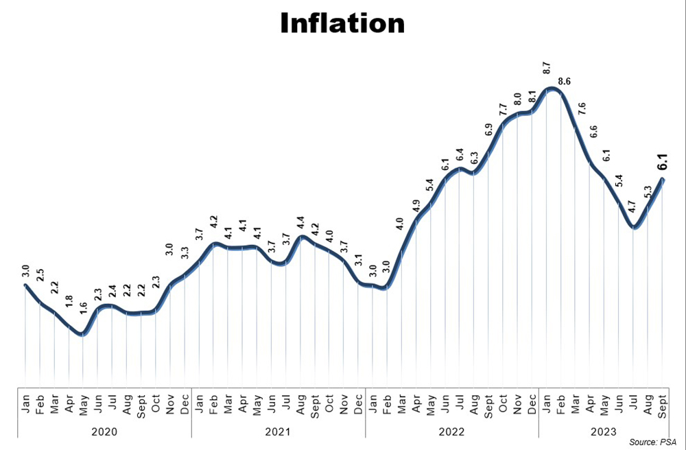 Food inflation at the national level rose to 10 percent from 8.2 percent, mainly brought about by the higher inflation for rice with a double-digit inflation rate of 17.9 percent in September from 8.7 percent in August.