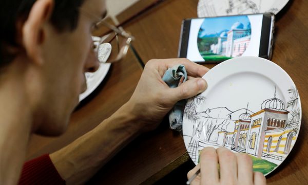 He has finished painting a view of the gallery and is now working on a piece dedicated to poet Alexander Pushkin, after whom the gallery is named and whose sculpture features as a centrepiece of its main exhibition.