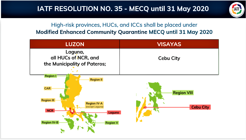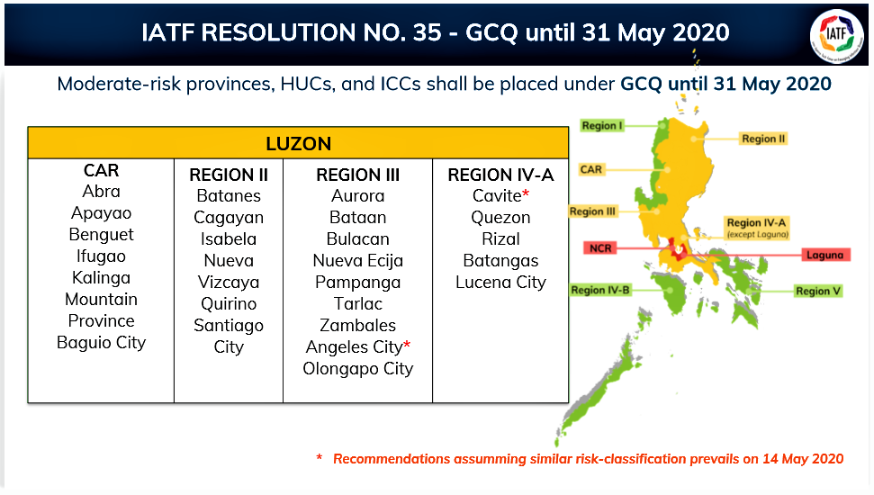 Roque announced that other areas in Luzon that have been under ECQ since March will be under general community quarantine (GCQ) from May 16 to May 31.