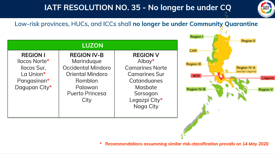Roque said the provinces of Ilocos Norte, La Union, Pangasinan and Albay, and the cities of Dagupan and Legazpi have been classified as low risk areas but are still subject to further review until May 14 to determine if they should be reclassified as moderate risk areas and be placed under GCQ.