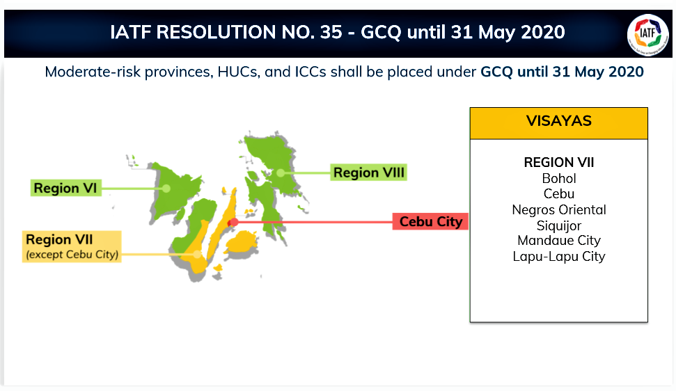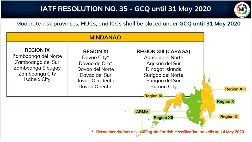 Roque said the IATF is monitoring the COVID-19 situation in Angeles City, Davao City, Cavite, and Davao de Oro and will review until May 14 if they will remain in the general community quarantine category or be included in the MECQ category.