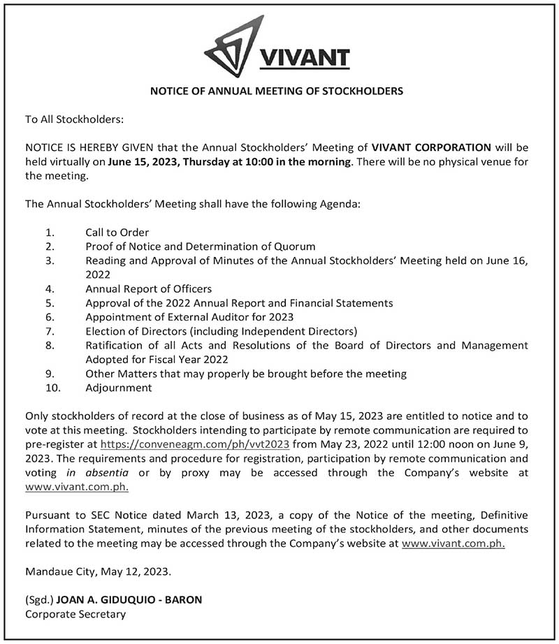 NOTICE OF ANNUAL MEETING OF STOCKHOLDERS: Vivant ___ May 18, 2023 Share FacebookTwitterPinterestWhatsApp Previous articleNOTICE OF ANNUAL STOCKHOLDERS’ MEETING: Century Properties, Inc.Next articleNext gen Ford Ranger Raptor takes off-road capability to the next level ___ Share post: FacebookTwitterPinterestWhatsApp