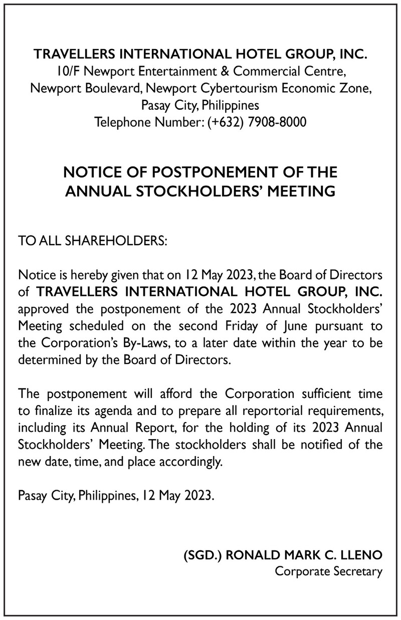 NOTICE OF POSTPONEMENT OF ANNUAL STOCKHOLDERS’ MEETING: Travellers International Hotel Group, Inc. ___ May 18, 2023 Share FacebookTwitterPinterestWhatsApp Previous articleBallet Manila performs ‘Don Quixote’Next articleANNUAL STOCKHOLDERS’ MEETING: SPC Power Corporation ___ Share post: FacebookTwitterPinterestWhatsApp